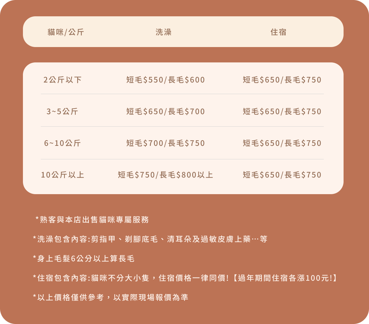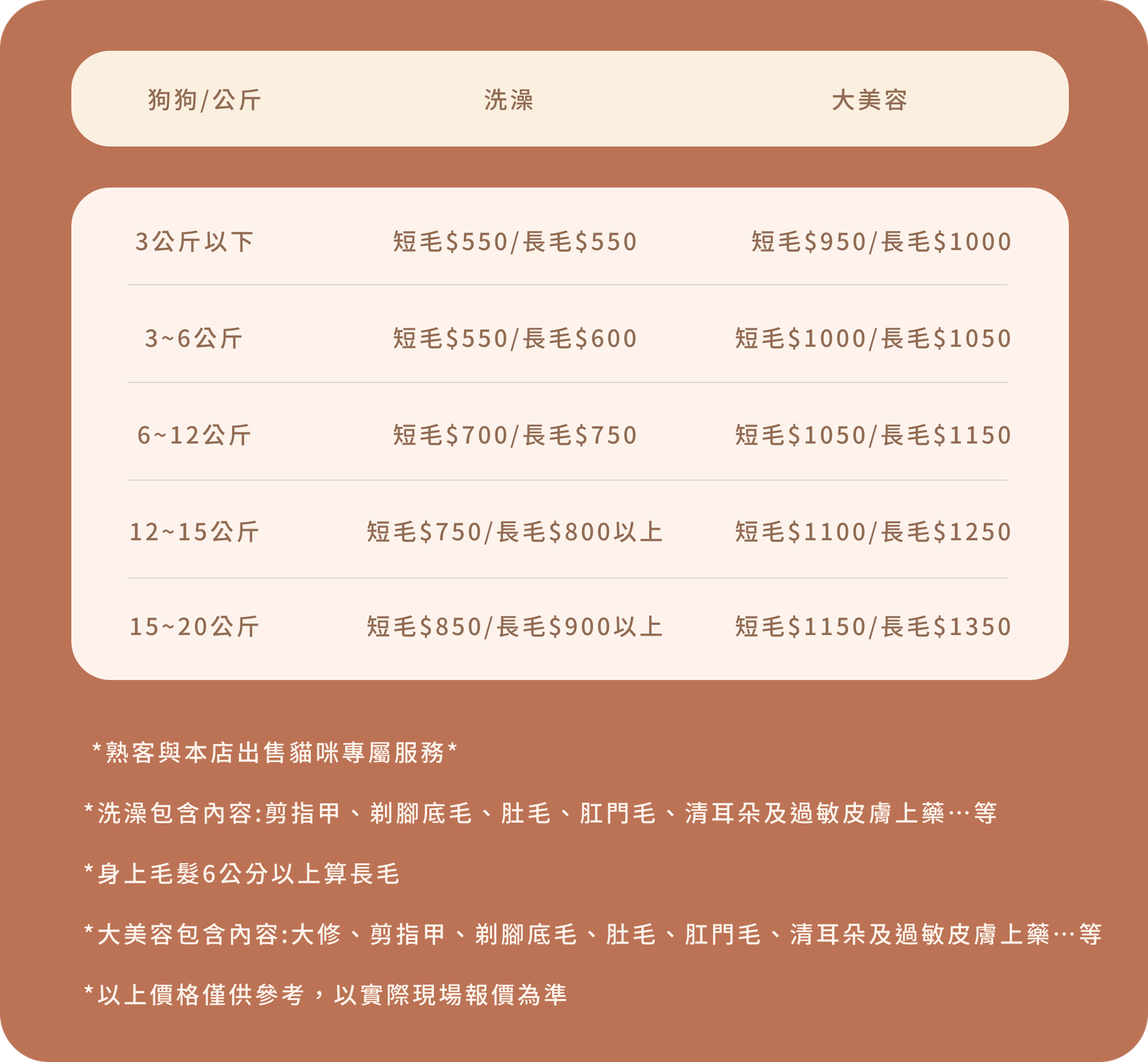 限時活動!來店賞貓,送小禮物! 貓咪買賣終生售後服務提供本店貓咪回娘家住宿優惠方案(平日550、國定連假650) 貓咪買賣終生售後服務提供本店貓咪回娘家住宿優惠方案(平日550、國定連假650) 立即預約賞貓 服務項目 貓咪買賣 貓咪住宿 飼養問題諮詢 貓狗美容 寵物用品販售 寵物認養 寵物送行 寵物登記 貓咪美容價目表 每一項美容服務,我們都以專業技巧與細心呵護為基礎,從毛髮修剪到清潔護理,都為您的寵物提供舒適、安全的體驗。 狗狗美容價目表 透明價目,讓您清楚了解每一項服務內容與費用,安心選擇,放心托付。